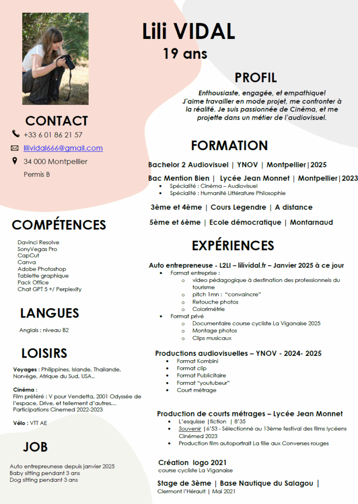 Après mon BAC obtenu avec mention Bien, j’ai choisi de poursuivre mon cursus dans l’école supérieure Ynov, pour approfondir mes compétences et devenir une professionnelle de l’audiovisuel et de la production de contenus.